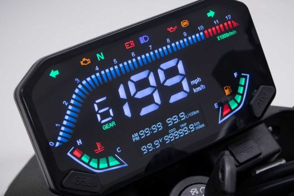 Göstergeler, negatif karakterli (siyah zemin üzerine beyaz) renkli bir LCD dijital ekrana ve tipik Yarış ekranına sahiptir. Bu özellik, sürüş sırasında bilgileri kolayca okumanızı sağlar ve yolculuğunuz boyunca size güncel ve net bilgiler sunar.